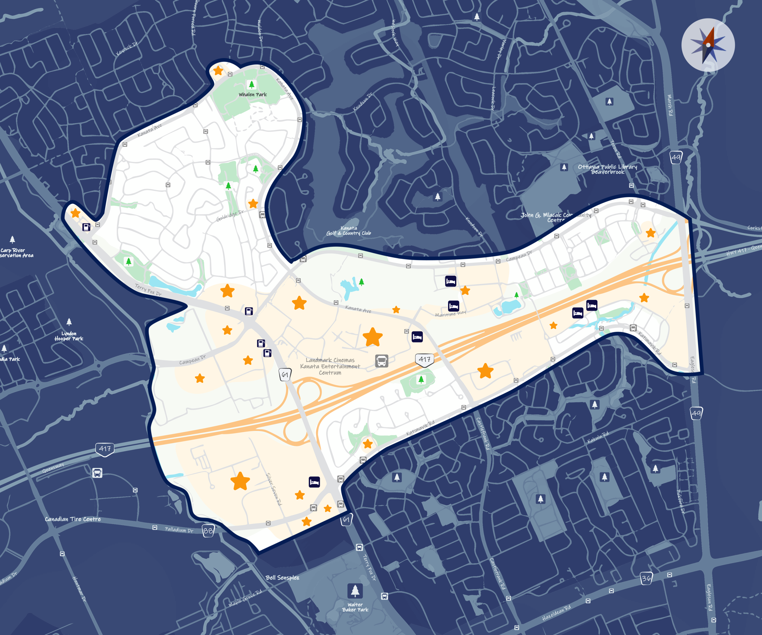The Kanata Central BIA comprises more than 320 stores and businesses, it stretches from Terry Fox Drive, Kanata Avenue, and Campeau Drive to Palladium Drive and Katimavik Road, bordering Eagleson Road.